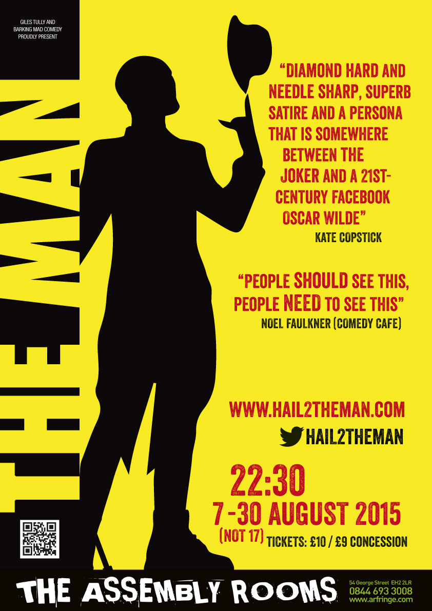 Come see the birth of a true modern jester, a voice for the people. The Man is a punchy and surreal atomisation of the shadowy controlling forces that shape our modern world. A lone vigilante, The Man ploughs through sacred cows like an allegorical abattoir, doing for preconceptions what battering rams do for doors