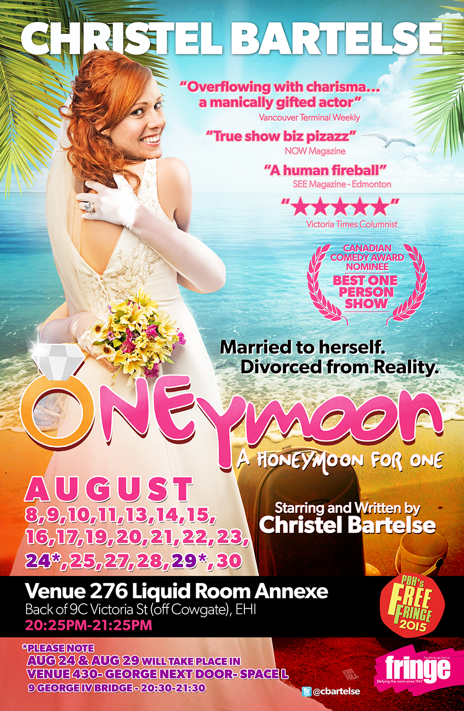 Canadian Caroline Bierman coined the phrase ‘ONEymoon’ and reinvented a long standing social convention. This celebration was nominated for a Canadian Comedy Award, Best Solo Show. Audiences join Caroline as her family and friends toast her unusual day and get a sneak peak at her vacation and rise to fame. Rapping. Dancing. Speeches. Your presence is gift enough. Christel Bartelse is a Canadian Fringe Veteran.