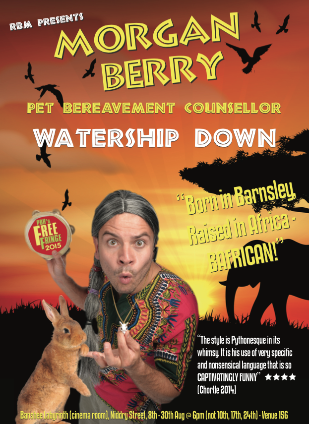 Join award-winning character comedian Joe Rowntree for the rare and wonderful specimen Morgan Berry: Pet Bereavement Counsellor. Rabbit Specialist. Born in Barnsley, raised in Africa – Bafrican! The car wash is in trouble. Morgan must save it. Can his online course in Pet Bereavement yield dividends and stop it from going Watership Down.