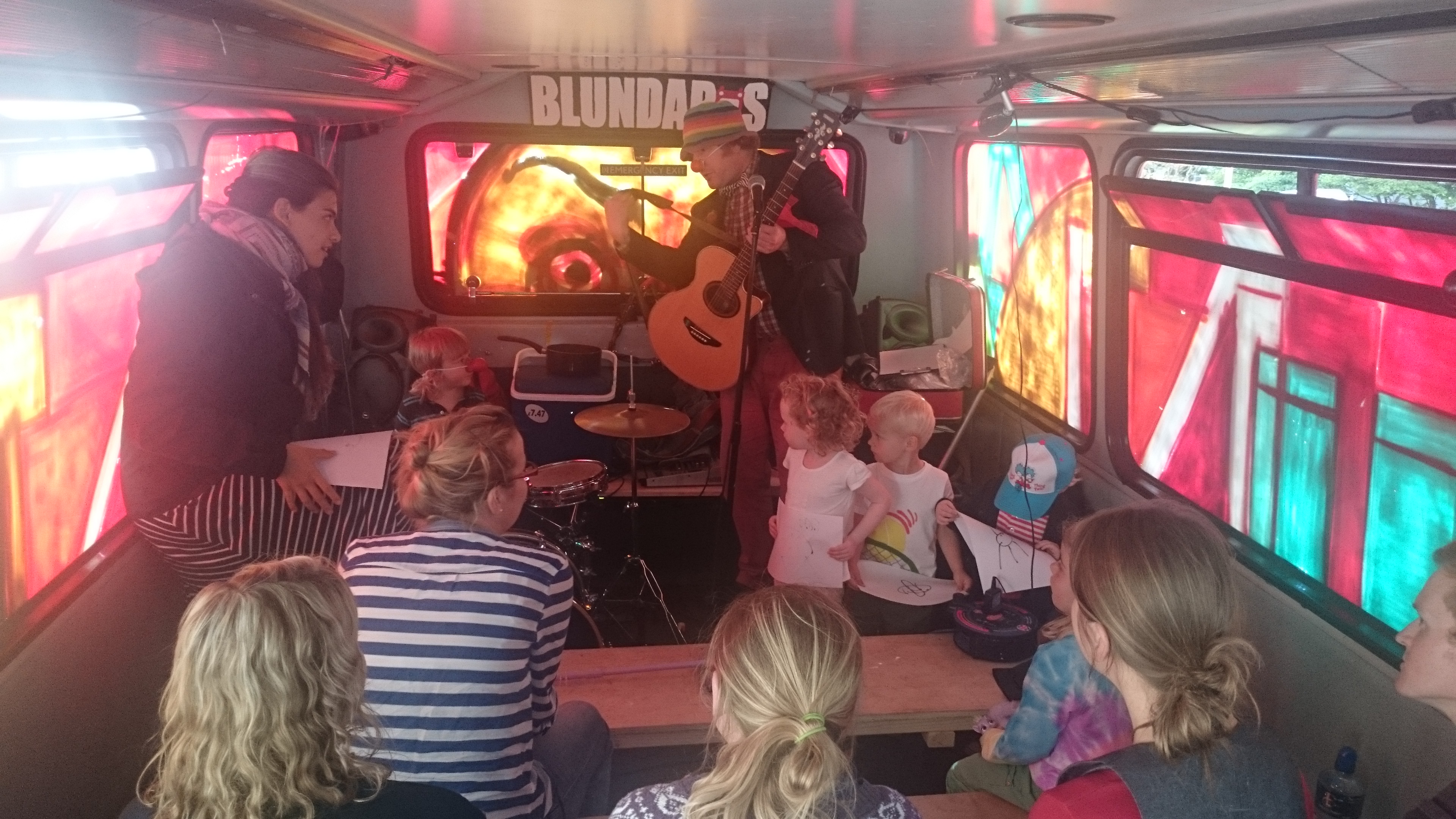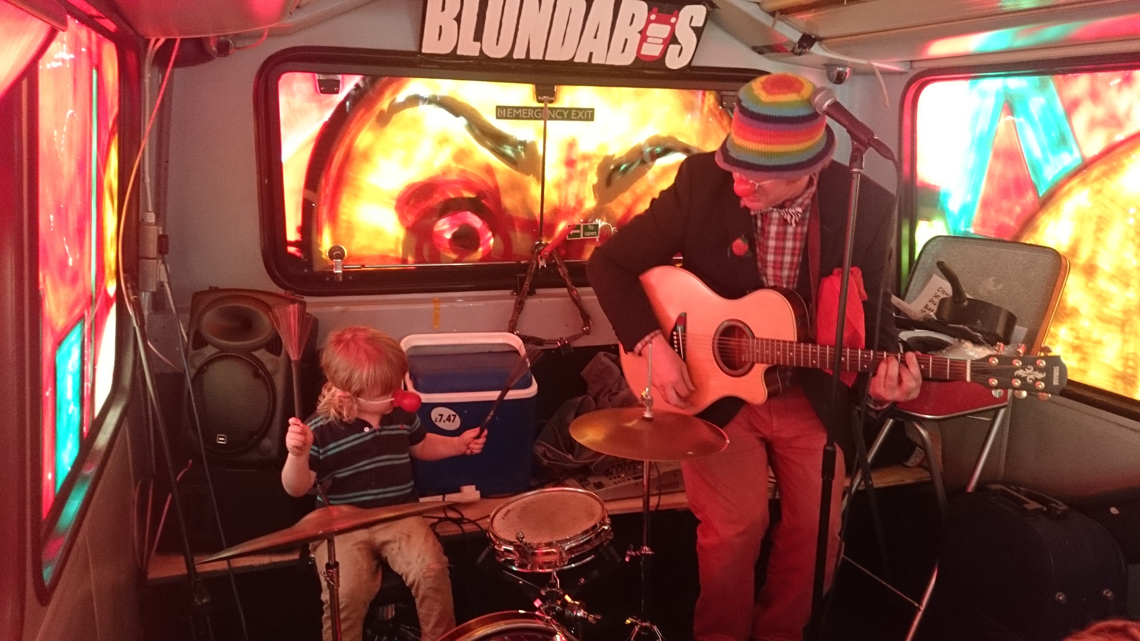 This was definitely a fine afternoon to be in Bobs Blundabus. As soon as I got up the stairs the upper deck sparkled as the sun shone in over the leafy underpass and ignited the colour of the painted glass in this recently converted double decker. Local legend Cammy Sinclair was at the back of the bus which has been kitted out with rows of benches that do a brilliant job of maximizing the space. With about 15 adults and 4 children it is comfortable and cozy. He kicks this family show off with a song about a dog with its legs cut off, ‘This songs for the adults, you wont understand it,’ Cammy explains to a child in the front row and to be fair none of us do but that’s the point, there’s something VERY Ivor Cutler about it. Behind the drum kit, up front, Cammy’s son Robin is in charge of the good majority of the show. Cammy constantly looking to him for direction, its very sweet. Not at all like some of the scenarios you expect when parents get their children involved with performance. They are playing, I’ve no doubt the in the same way they do at home so its almost like an insight into their eccentric and fascinating relationship instead of a strictly choreographed show.