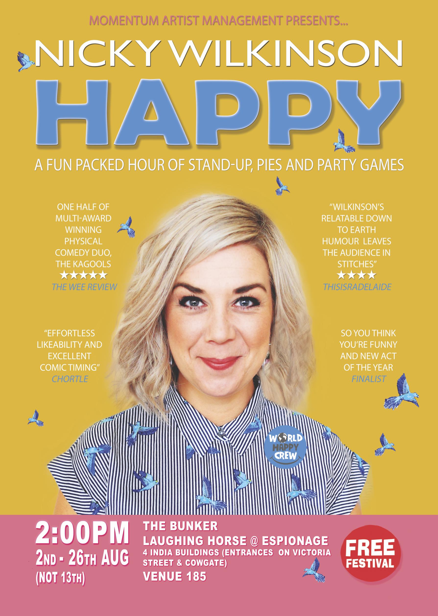 Nicky Wilkson, one half of the acclaimed duo, The Kagools, stands like Bob Dylan in his Subterranean Homesick Blues video, flicking through a white pad on which are written the things which make her happy. As we join her lovely dream, Nicky makes everyone feel cool & inclusive, & is not shy with the free pork pies. We play game shows such as the fairly insane mechanics behind Pass the Bingo & also Hanky Panky, which is not as sexy as it sounds. She also plays the spoons extraordinarily well, & the general vibe is one of watching Biggles in biplane strafing the audience with her cheeky parlour room funathon. In this instance, Nicky is a children’s entertainer for adults & no-one left the room without their fun levels topped up for the day.