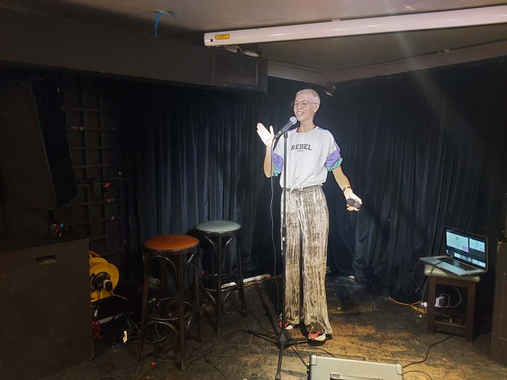 So, to Hannah Fairweather, my first comedian of 2022. I’d set off from home on Arran on the 11 am ferry & reached Waverly at 2.12, giving me precisely 8 minutes to make the show. Arriving out of breath I took a seat at the back in time to hear Hannah’s irrepressibly seductive opening salvoes, a really entertaining introductory unicorn bounce thro, ‘hello I’m Hannah, & welcome to my show’. I was immediately glad to be there.