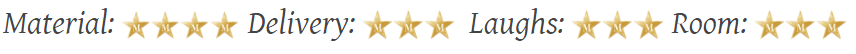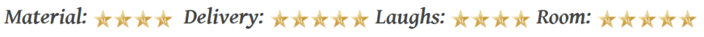 Under our old system, to obtain four stars, for example, a show needed to score 3.66 – which is simply closer to 4 than 3. The overall marks would then be described as a low four, a natural four or a high four. The eureka moment came the other day while sitting in two comedy shows. On one occasion I was the only one laughing, while at the other show the room was in uproar & I was sat stony-gilled. It was time to add that factor into the marking mix, the Room… how does a comedian play their audience, do they keep tickling funny bones like a comedy octopus, or is each viewer sat there playing on their phones.
